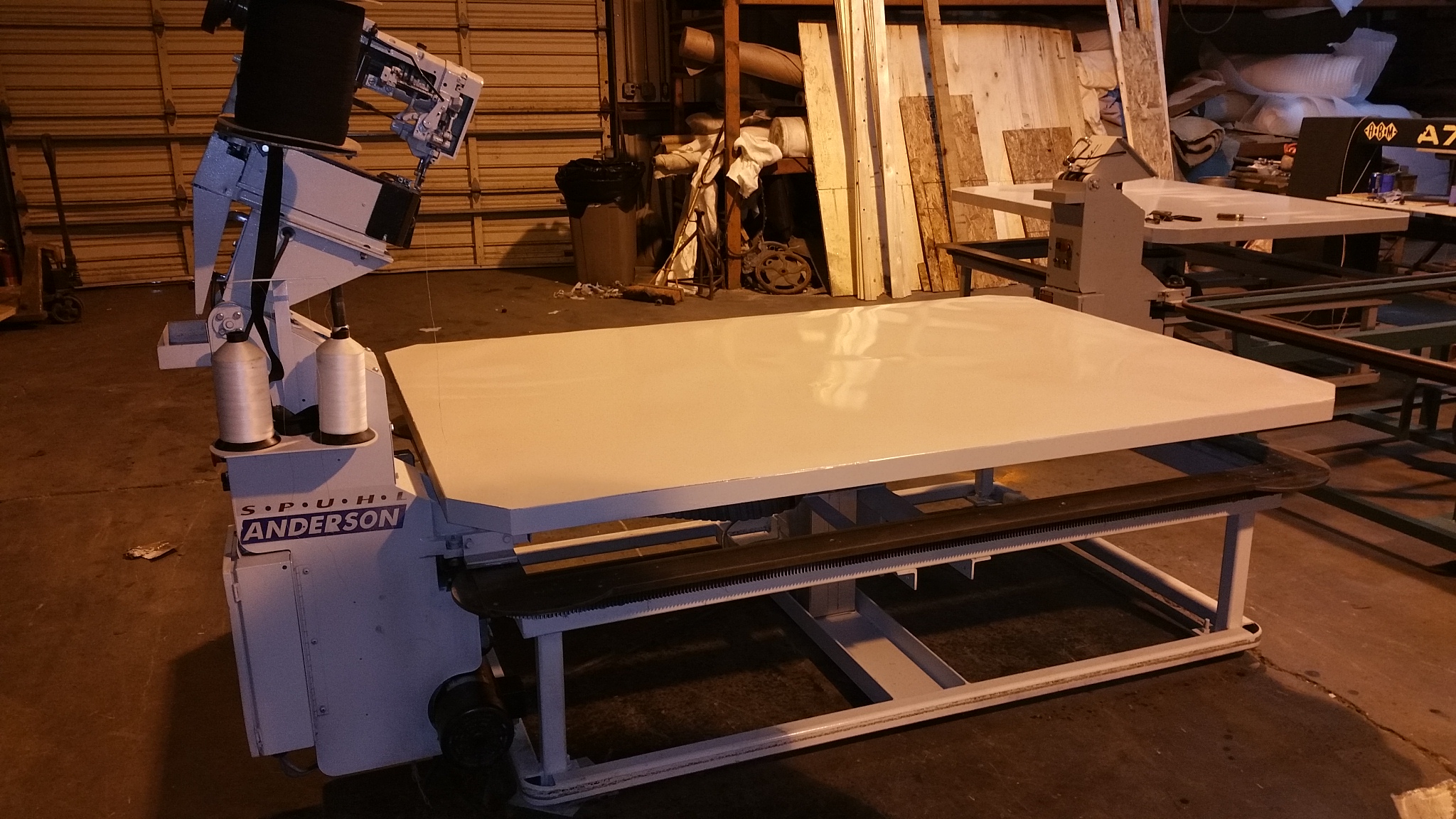 SPUHL ANDERSON TAPE EDGE MACHINE, QUEEN SIZE WITH EXTENSION TO KING, HIGH LIFT 18 INCHES